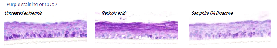 Através do teste in vitro, ao contrário do retinol estabilizado, Samphira Oil Bioactive não induz a nenhuma reação inflamatória. Através da redução de mediadores inflamatórios (interleucina 1A, interleucina 6 e interleucina 8) apresenta efeito calmante, sendo uma alternativa ao retinol para todos os tipos de pele, mesmo para as peles sensíveis ou sensibilizadas.